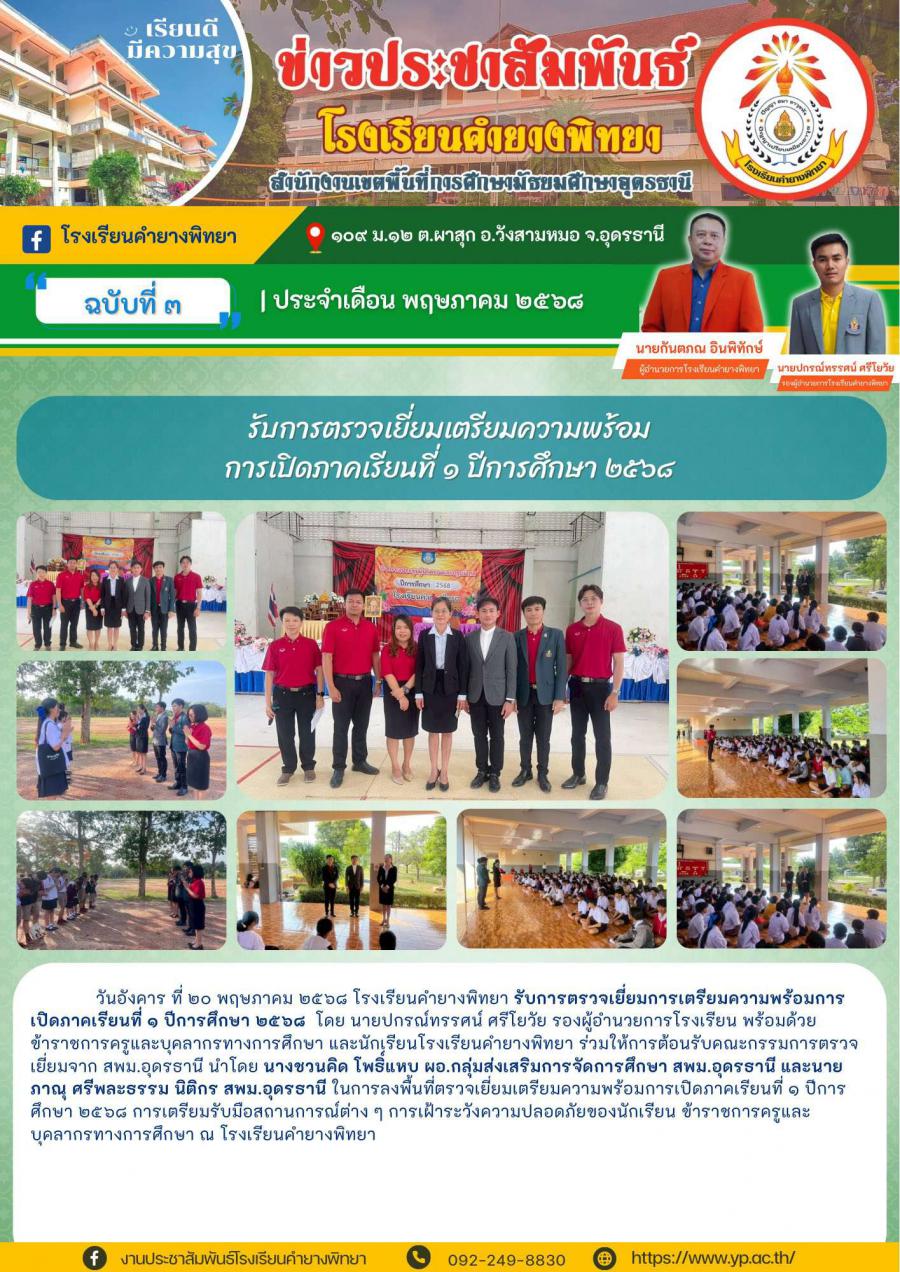 วันอังคาร ที่ ๒๐ พฤษภาคม ๒๕๖๘ โรงเรียนคำยางพิทยา รับการตรวจเยี่ยมการเตรียมความพร้อมการเปิดภาคเรียนที่ ๑ ปีการศึกษา ๒๕๖๘ โดย นายปกรณ์ทรรศน์ ศรีโยวัย รองผู้อำนวยการโรงเรียน พร้อมด้วยข้าราชการครูและบุคลากรทางการศึกษา และนักเรียนโรงเรียนคำยางพิทยา ร่วมให้การต้อนรับคณะกรรมการตรวจเยี่ยมจาก สพม.อุดรธานี นำโดย นางชวนคิด โพธิ์แหบ ผอ.กลุ่มส่งเสริมการจัดการศึกษา สพม.อุดรธานี และนายภาณุ ศรีพละธรรม นิติกร สพม.อุดรธานี ในการลงพื้นที่ตรวจเยี่ยมเตรียมความพร้อมการเปิดภาคเรียนที่ ๑ ปีการศึกษา ๒๕๖๘ การเตรียมรับมือสถานการณ์ต่าง ๆ การเฝ้าระวังความปลอดภัยของนักเรียน ข้าราชการครูและบุคลากรทางการศึกษา ณ โรงเรียนคำยางพิทยา